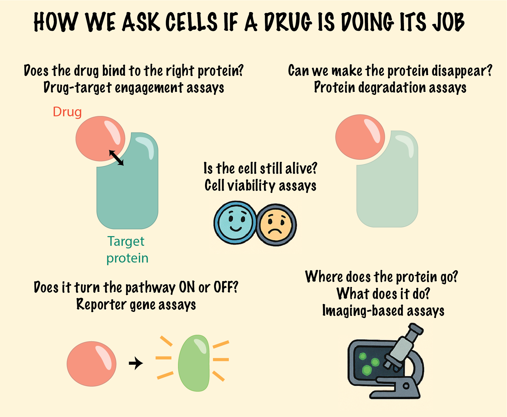 A visual guide to the key questions we ask in cell-based assays: Does the drug bind its target? Does it activate or block a pathway? Can it degrade a protein, keep the cell alive, or change where proteins go? Each assay type gives us a piece of the puzzle—together, they reveal the full story of how a drug behaves inside a living cell.