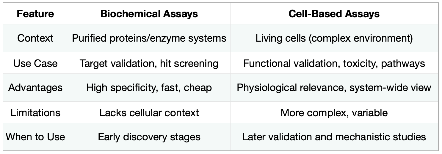 A side-by-side comparison of biochemical and cell-based assays, highlighting how each contributes unique insights to drug discovery. While biochemical assays offer precise control and clarity, cell-based assays provide context and complexity—making them complementary tools in understanding drug function.
