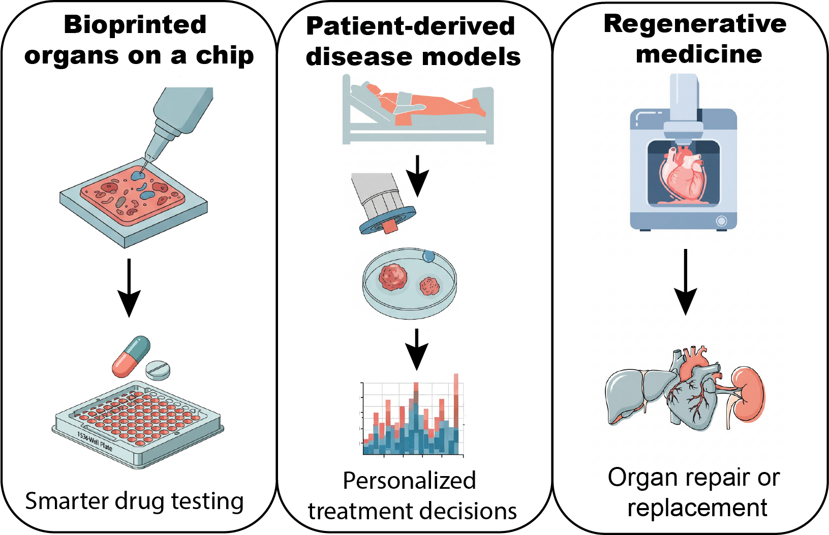 This illustration highlights the core applications of 3D bioprinting in biomedical research. By enabling the creation of human-relevant tissue models, 3D bioprinting is accelerating drug discovery and improving the accuracy of preclinical testing. It also opens new avenues for personalized medicine using patient-derived tissues and supports regenerative medicine through functional implants, such as cardiac patches.